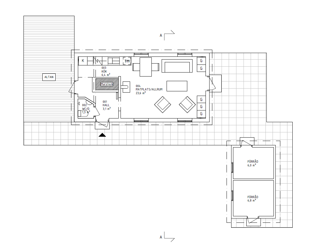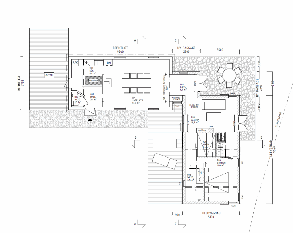 Genom en passage kopplas den gamla och nya delen ihop. På så sätt görs minimal åverkan i den befintliga stugan och de två volymerna blir enkla att skilja åt. Samtidigt behålla släktskap genom materialval och proportioner.